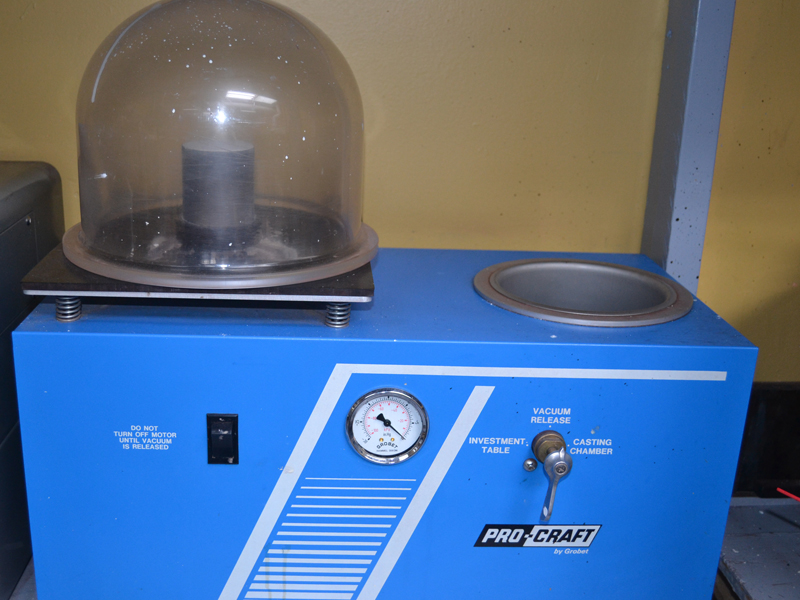 Before curing, the investment-filled flask is placed in a vacuum chamber to eliminate any trapped air bubbles. This ensures a smooth, detailed mold, resulting in a flawless casting of your custom piece.