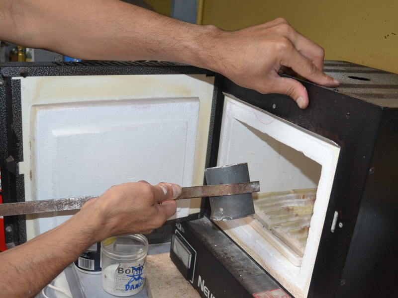 Once the investment hardens, the rubber sprue base is removed and the flask is placed into a high-temperature oven. This incinerates the wax, leaving behind a clean, detailed cavity — fully prepared for the casting process.