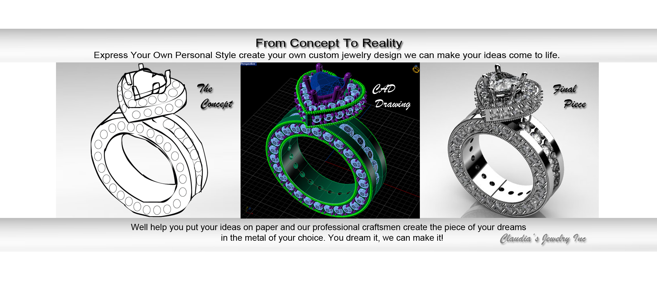 At Claudia’s Jewelry Inc., we specialize in turning your ideas into beautifully crafted custom jewelry. Whether you have a design in mind or want to modify an existing piece, our skilled designer will guide you through every step — from concept to completion.