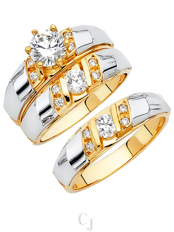 - His and her 14K Gold 3 Piece cubic zirconia wedding rings featuring a complete three ring matching wedding set including engagement ring and mens and ladies matching wedding bands.