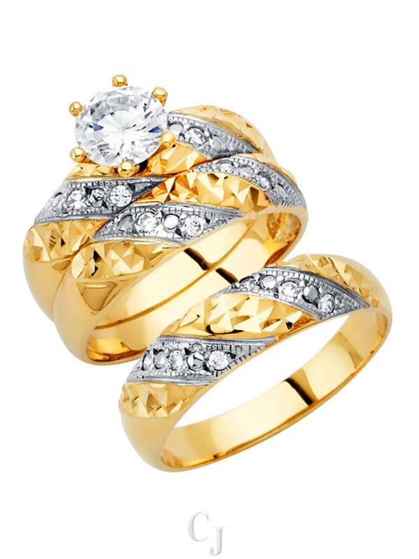 - His and her 14K Gold 3 Piece cubic zirconia wedding rings featuring a complete three ring matching wedding set including engagement ring and mens and ladies matching wedding bands.