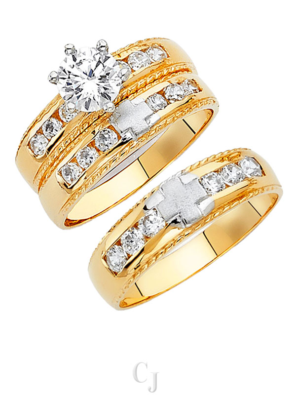 - His and her 14K Gold 3 Piece cubic zirconia wedding rings featuring a complete three ring matching wedding set including engagement ring and mens and ladies matching wedding bands.