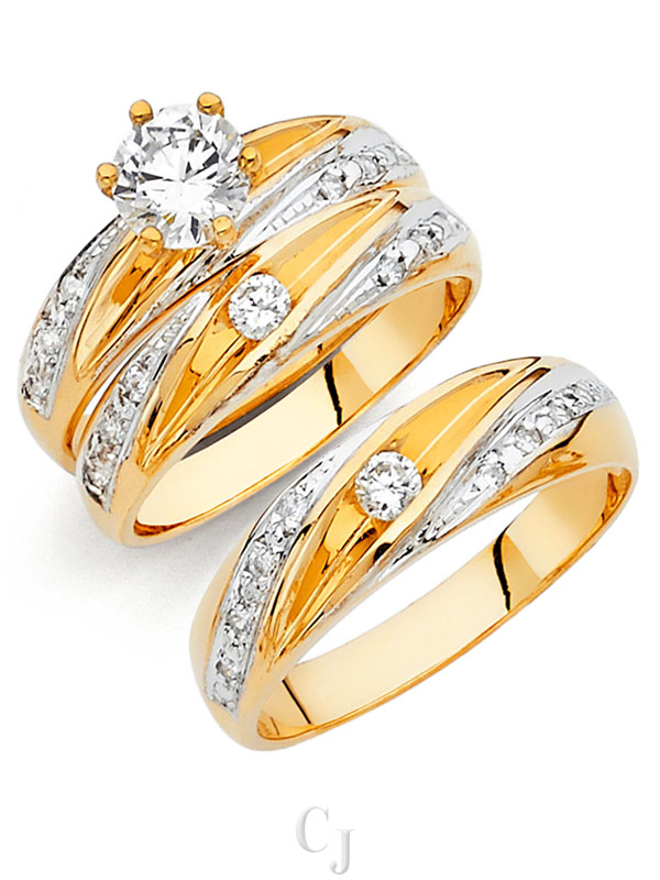 - His and her 14K Gold 3 Piece cubic zirconia wedding rings featuring a complete three ring matching wedding set including engagement ring and mens and ladies matching wedding bands.