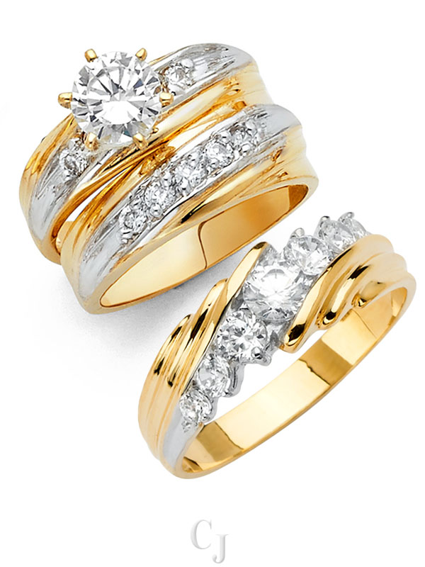 - His and her 14K Gold 3 Piece cubic zirconia wedding rings featuring a complete three ring matching wedding set including engagement ring and mens and ladies matching wedding bands.