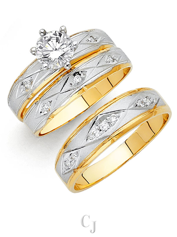 - His and her 14K Gold 3 Piece cubic zirconia wedding rings featuring a complete three ring matching wedding set including engagement ring and mens and ladies matching wedding bands.