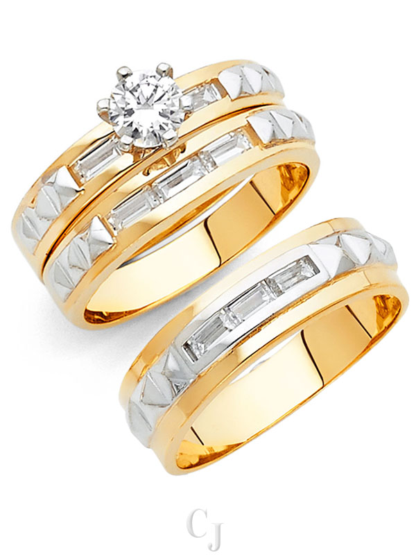 - His and her 14K Gold 3 Piece cubic zirconia wedding rings featuring a complete three ring matching wedding set including engagement ring and mens and ladies matching wedding bands.