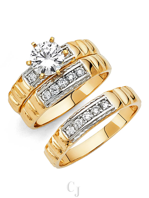 - His and her 14K Gold 3 Piece cubic zirconia wedding rings featuring a complete three ring matching wedding set including engagement ring and mens and ladies matching wedding bands.