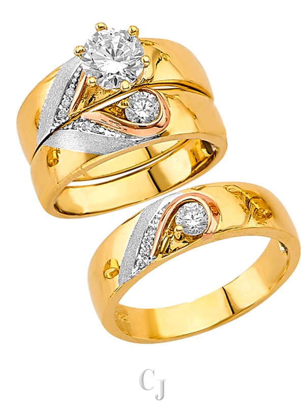 - His and her 14K Gold 3 Piece cubic zirconia wedding rings featuring a complete three ring matching wedding set including engagement ring and mens and ladies matching wedding bands.
