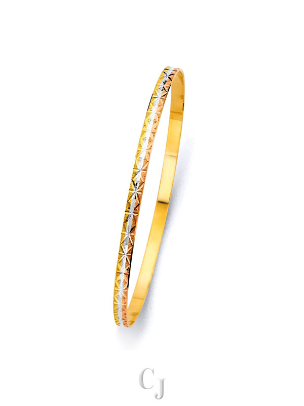 Make a statement with our 14K tri-color bangles, featuring a beautiful blend of white, yellow, and rose gold. These bangles offer a unique and elegant style that complements any look. Wear them solo or stacked for a bold, timeless touch.
