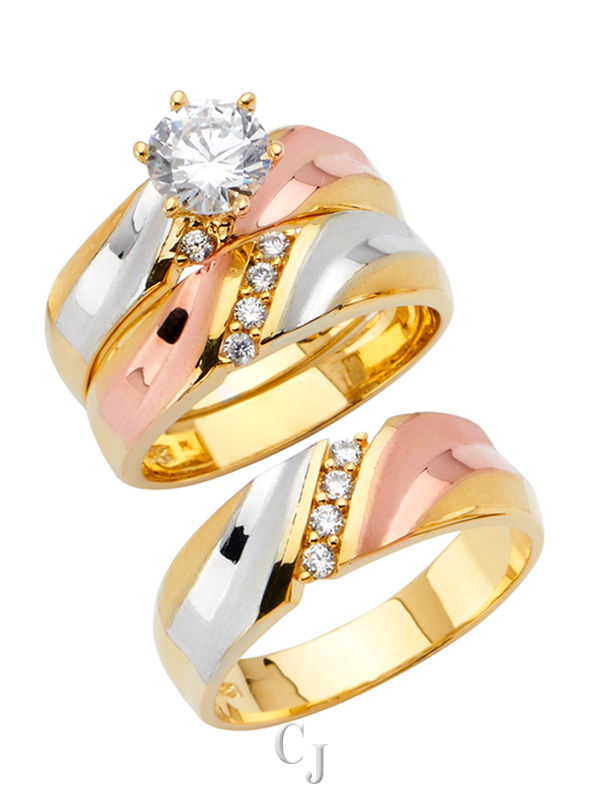 - His and her 14K Gold 3 Piece cubic zirconia wedding rings featuring a complete three ring matching wedding set including engagement ring and mens and ladies matching wedding bands.