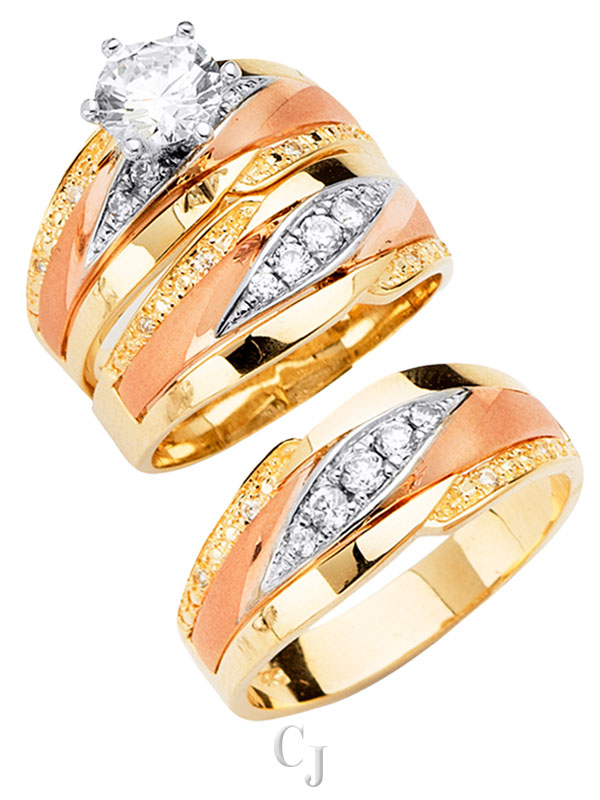 - His and her 14K Gold 3 Piece cubic zirconia wedding rings featuring a complete three ring matching wedding set including engagement ring and mens and ladies matching wedding bands.