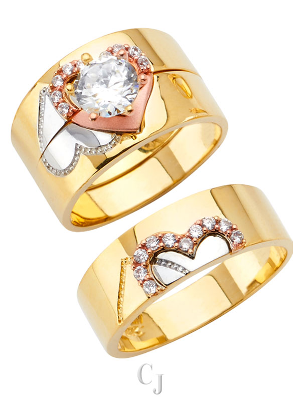 - His and her 14K Gold 3 Piece cubic zirconia wedding rings featuring a complete three ring matching wedding set including engagement ring and mens and ladies matching wedding bands.
