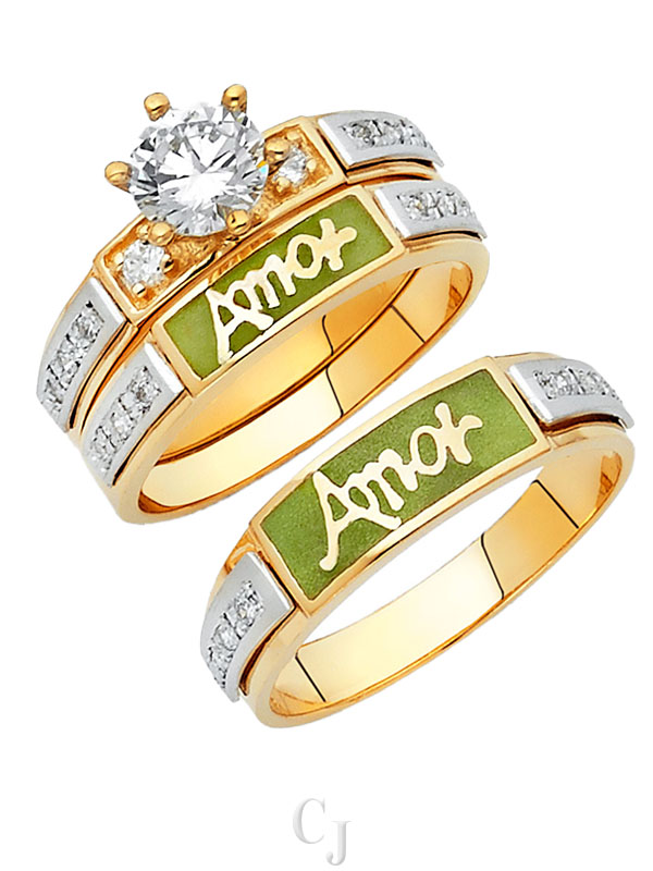 - His and her 14K Gold 3 Piece cubic zirconia wedding rings featuring a complete three ring matching wedding set including engagement ring and mens and ladies matching wedding bands.