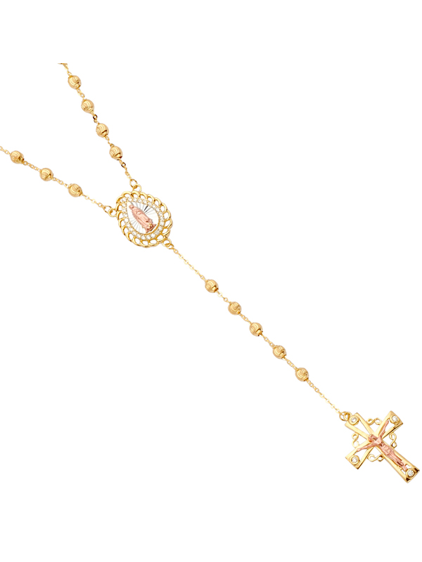 14k Gold Tri-Color 3mm Moon Cut Ball CZ Rosary Necklace