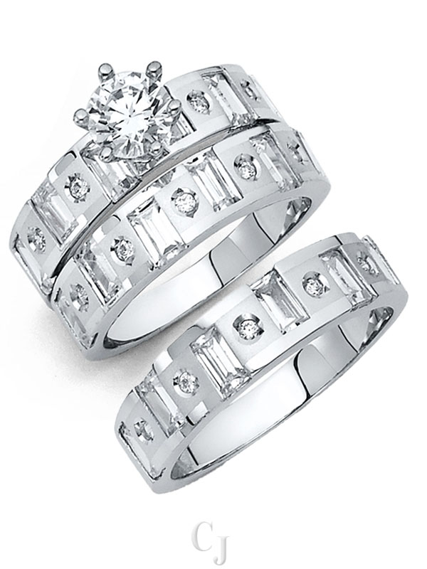 - His and her 14K Gold 3 Piece cubic zirconia wedding rings featuring a complete three ring matching wedding set including engagement ring and mens and ladies matching wedding bands.