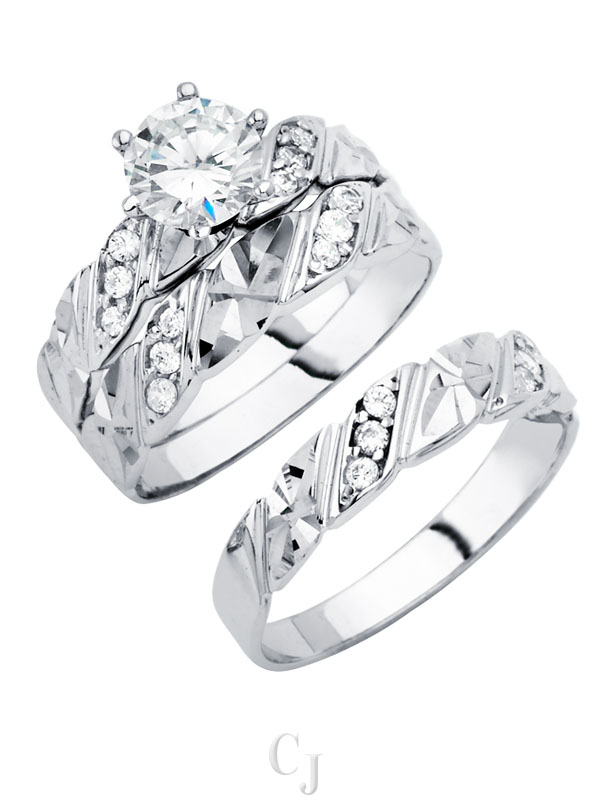 - His and her 14K Gold 3 Piece cubic zirconia wedding rings featuring a complete three ring matching wedding set including engagement ring and mens and ladies matching wedding bands.