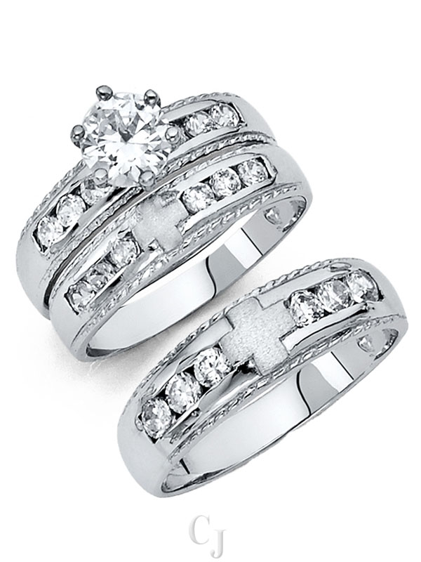 - His and her 14K Gold 3 Piece cubic zirconia wedding rings featuring a complete three ring matching wedding set including engagement ring and mens and ladies matching wedding bands.