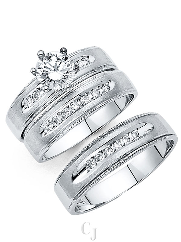 • His and her 14K Gold 3 Piece cubic zirconia wedding rings featuring a complete three ring matching wedding set including engagement ring and mens and ladies matching wedding bands.