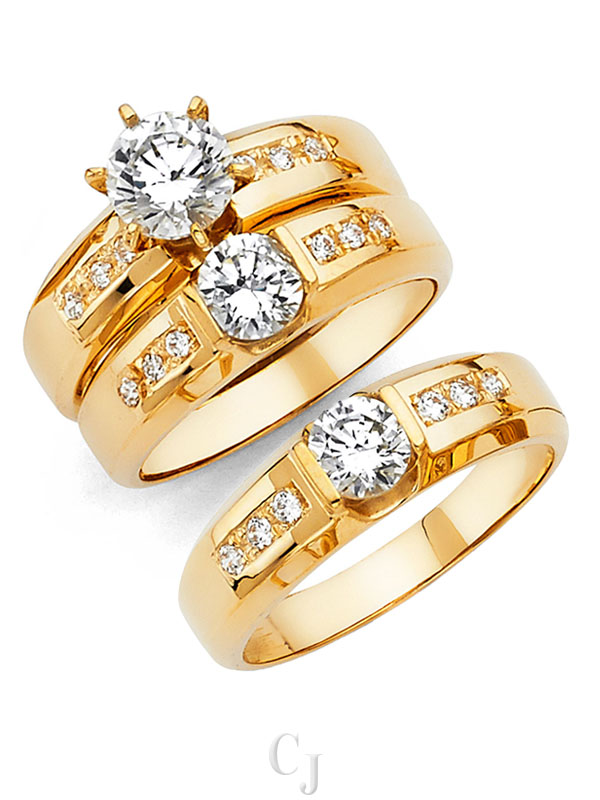 - His and her 14K Gold 3 Piece cubic zirconia wedding rings featuring a complete three ring matching wedding set including engagement ring and mens and ladies matching wedding bands.
