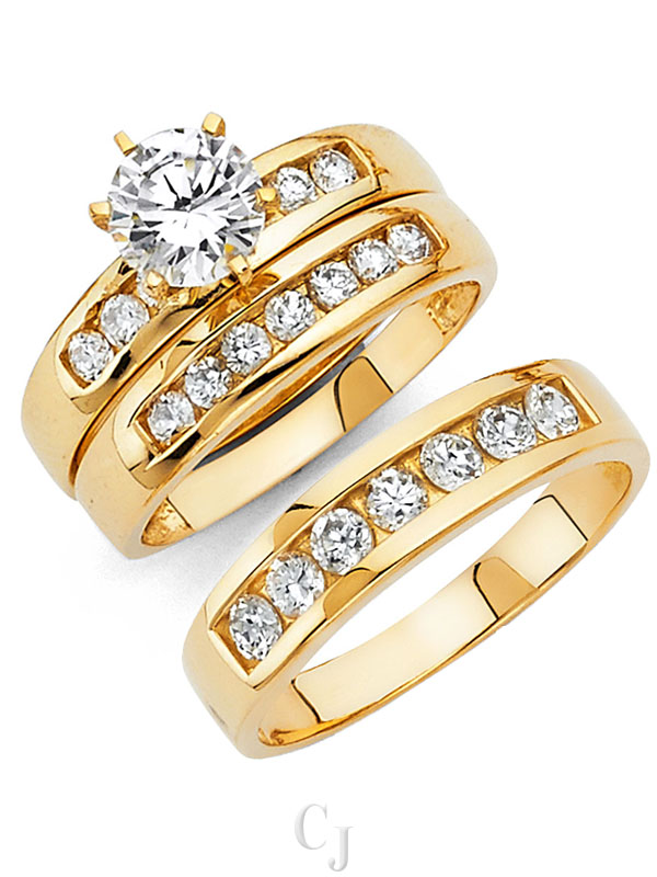- His and her 14K Gold 3 Piece cubic zirconia wedding rings featuring a complete three ring matching wedding set including engagement ring and mens and ladies matching wedding bands.