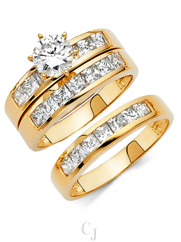 - His and her 14K Gold 3 Piece cubic zirconia wedding rings featuring a complete three ring matching wedding set including engagement ring and mens and ladies matching wedding bands.