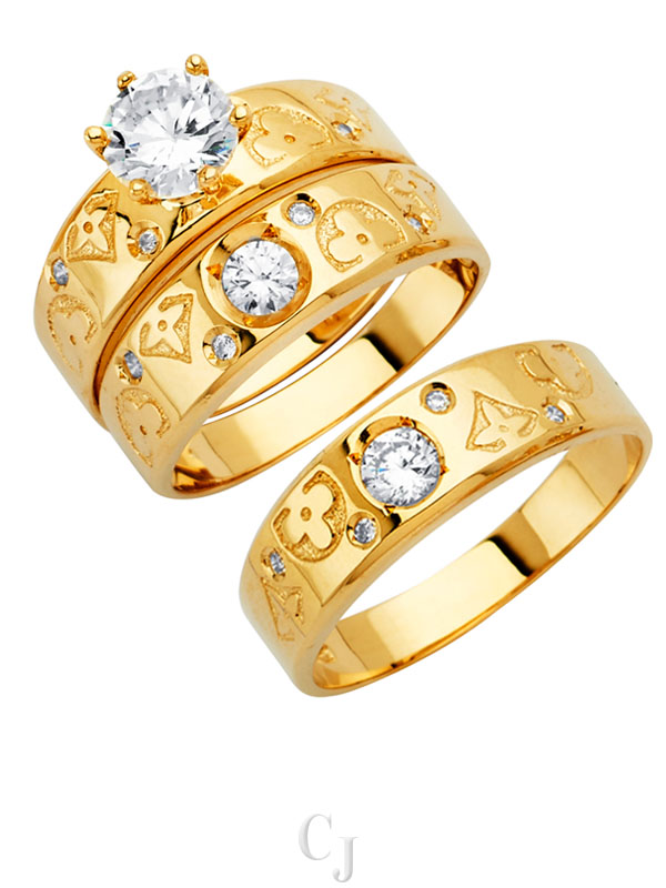 • His and her 14K Gold 3 Piece cubic zirconia wedding rings featuring a complete three ring matching wedding set including engagement ring and mens and ladies matching wedding bands.
