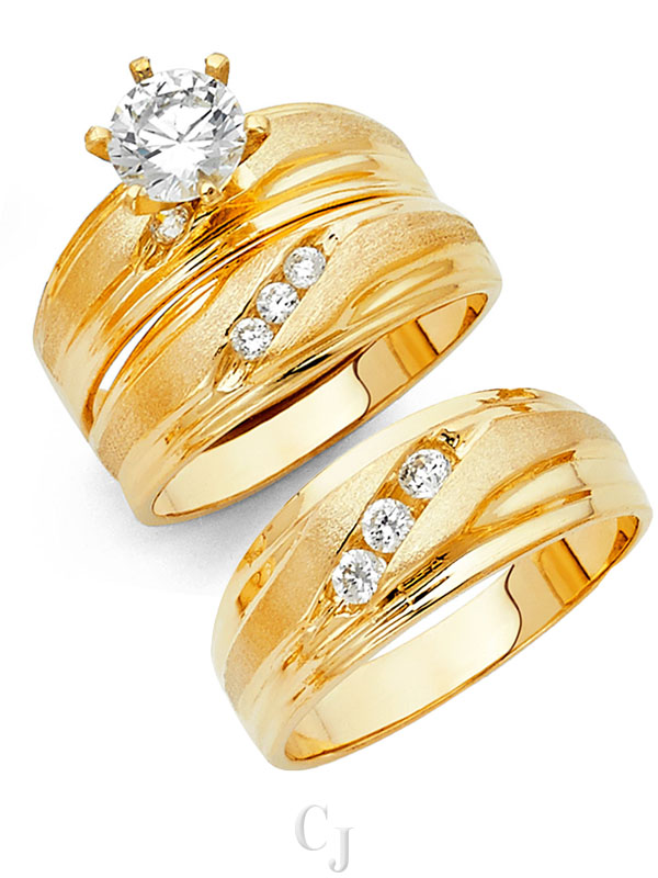 - His and her 14K Gold 3 Piece cubic zirconia wedding rings featuring a complete three ring matching wedding set including engagement ring and mens and ladies matching wedding bands.