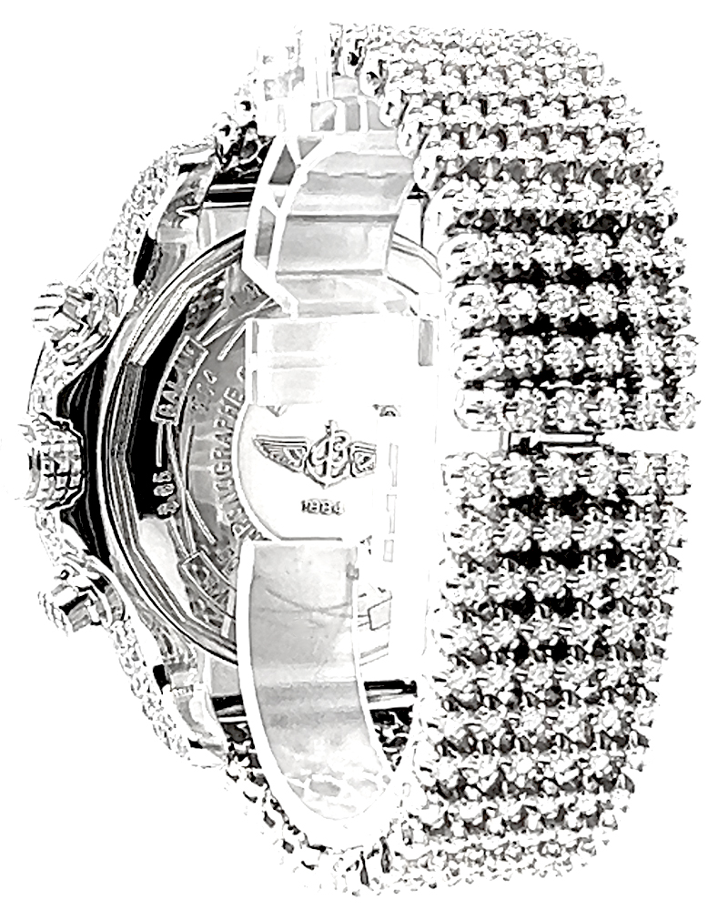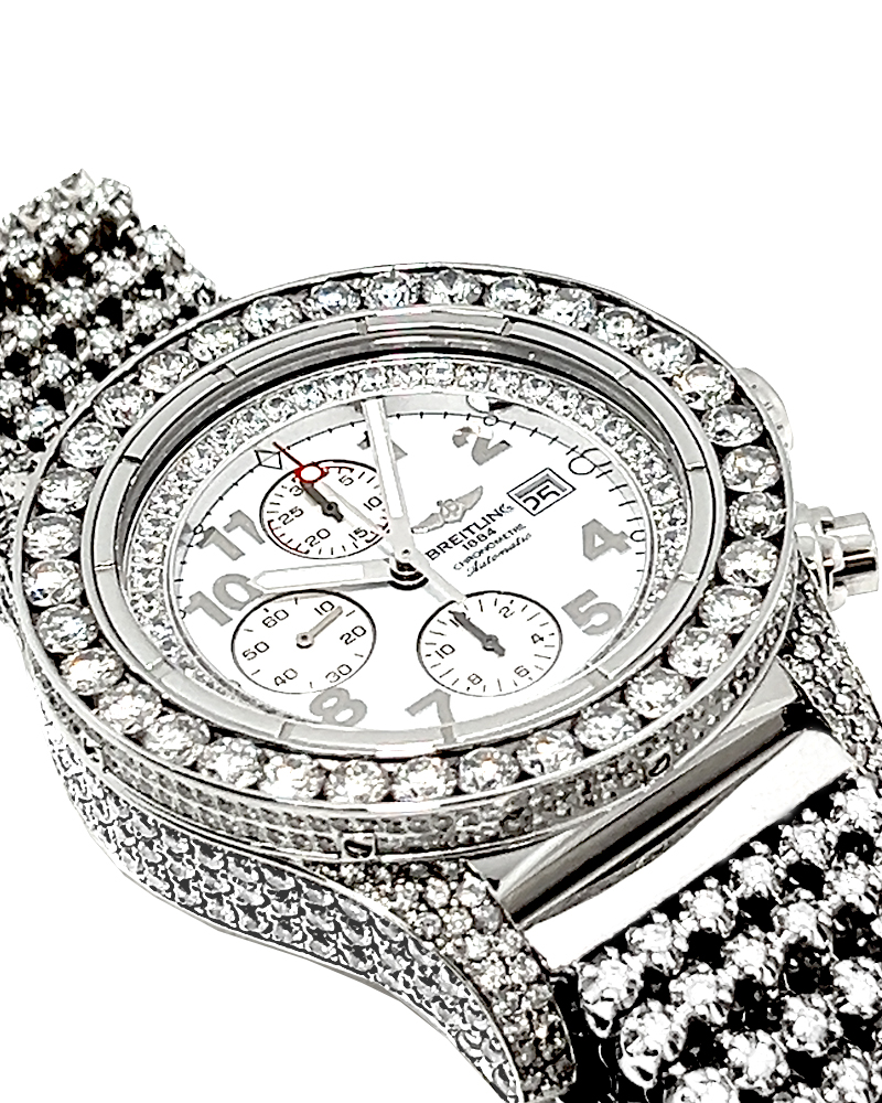 This Custom Iced Out Breitling watch features a stainless steel case custom set with genuine diamonds and Custom 10Kt White gold band custom set with genuine diamonds. The bezel is also adorned with diamonds, giving the watch a sparkling look. The watch is powered by an automatic movement, water resistant up to 100 meters(10 ATM), has a self-winding chronograph, White Dial with three chronograph subdials, a scratch-resistant glare-proof sapphire crystal, a screw-down crown & case back, and luminescent hands & markers. Diamond Weight Total: 25.0 CT Aprox. Genuine Natural Diamonds