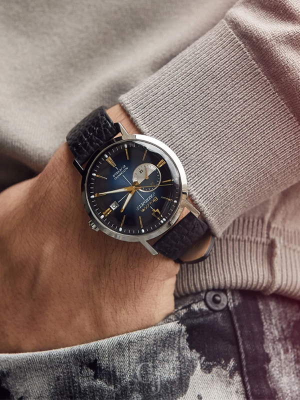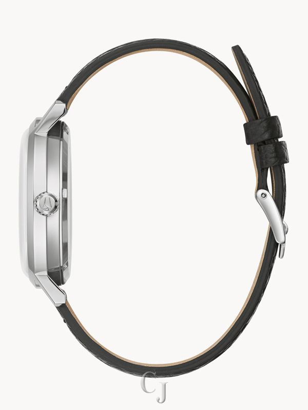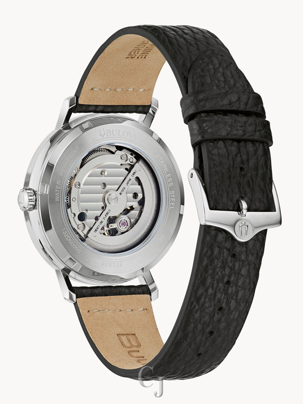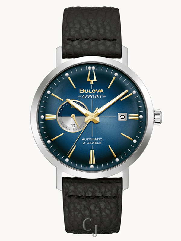 Bulova’s new automatic models in the Aerojet line bring a contemporary flair to this classic luxury watch inspired by vintage timepieces. The striking sunray blue dial includes gold-tone accents and a bi-color day/night indicator. The signature cross-hair detail is enhanced with an ombre effect radiating from a pale color at the center to a rich dark blue at the edges. The vintage Aerojet logo adds an authentic retro feel to the timepiece. The case is stainless steel, with a screw-back featuring a mineral crystal exhibition window. The look is enhanced with a supple black leather strap for a rich elegance that will stand out. This sophisticated watch is destined to become a favorite in any collection.