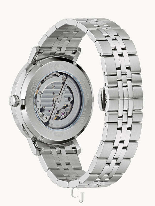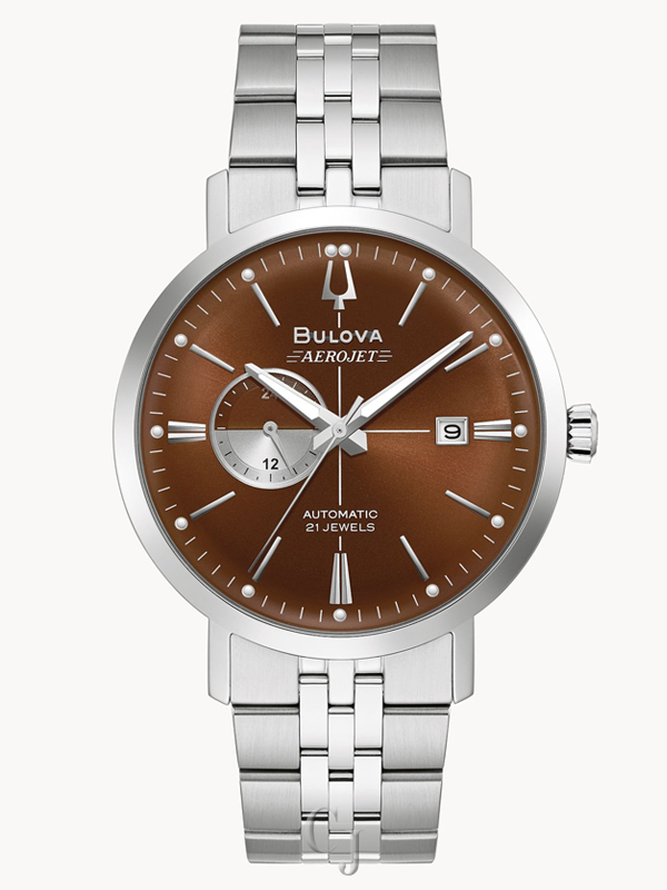 Bulova’s new automatic models in the Aerojet line bring a contemporary flair to this classic luxury watch inspired by vintage timepieces. The striking brown dial with silver-tone accents and the signature cross-hair detail features a sunray dial and bi-color day/night indicator. The vintage Aerojet logo adds an authentic retro feel to the timepiece. The case is stainless steel with a screw-back featuring a mineral crystal exhibition window. The look is enhanced with a stainless steel bracelet. This sophisticated watch is destined to become a favorite in any collection.