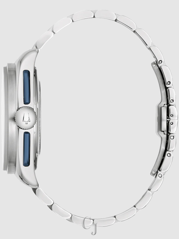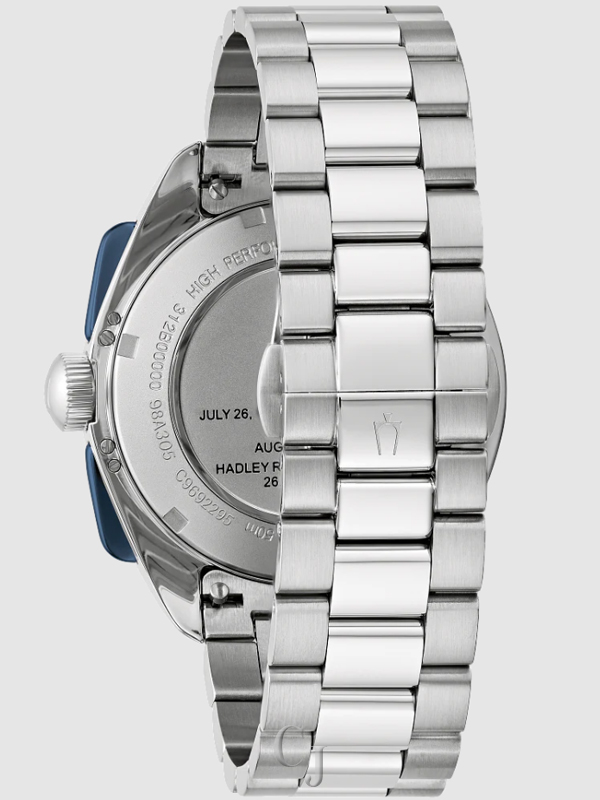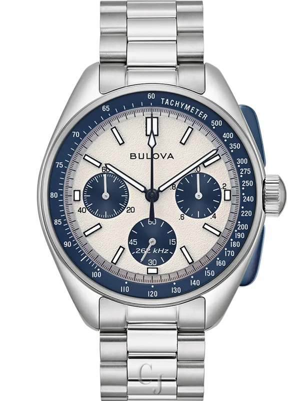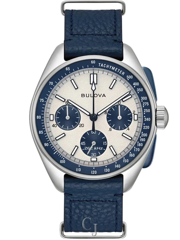 On August 2, 1971, a Bulova chronograph was worn on the moon, engineered by Bulova for the demands of the lunar environment. Now, Bulova returns to the design and updates it with an exclusive high precision quartz movement, continuing its legacy of precision timing with the men’s Bulova Lunar Pilot chronograph from the Archive Series. The Lunar Pilot chronograph features the same 43.5mm silver-tone stainless steel case as the original Bulova moon pilot chronograph. Slim, blue chronograph pushers and a crown featuring the Bulova tuning fork logo are positioned at 3 o’clock. Under the flat sapphire crystal, the six-hand chronograph dial is rendered in a blue-and-silver panda design, with a blue tachymeter ring and retro Bulova name. The slim hands and applied markers offer exceptional legibility and are applied with super luminova for low-light display. The recessed, circular grooved sub-dials include a 1/20 chronograph seconds counter at 3 o’clock, running seconds with a sweep hand at 6 o’clock, and 60-minute chronograph counter at 9 o’clock. The Lunar Pilot is powered by Bulova’s proprietary high precision quartz movement, resonating at a frequency of 262khz for unparalleled accuracy and allowing a sweeping chronograph hand and running seconds hand. The watch is paired with a matching 3-link silver-tone stainless steel bracelet with a push-button deployant clasp and a fitted leather strap, both of which feature an easy release system for quick changes. A modern interpretation of a historic timepiece, the Bulova Lunar Pilot is the ideal watch for today’s explorer.