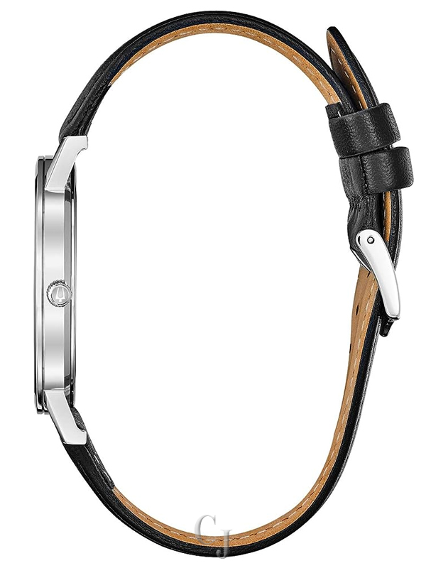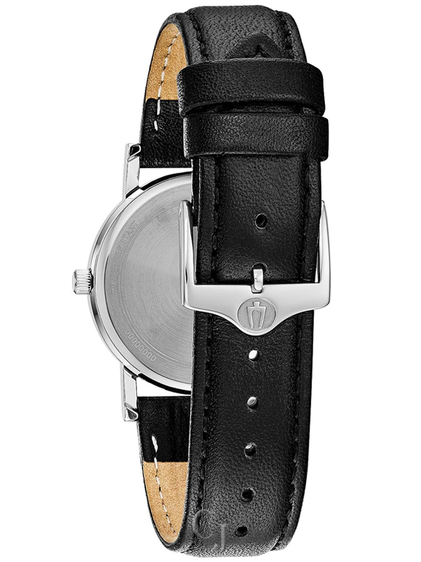 Silver-tone stainless steel case with a black leather strap. Fixed silver-tone stainless steel bezel. Black dial with rose gold-tone and hand-set diamonds at at the 3, 6, 9 positions hands. Dial Type: Analog. Date display at the 6 o’clock position. Quartz movement. Scratch resistant mineral crystal. Solid case back. Round case shape, case size: 32 mm. Buckle clasp. Water resistant at 30 meters / 100 feet. Functions: date, hour, minute, second. Fashion watch style. Bulova Classic American Clipper Black Dial Ladies Watch 96P192.