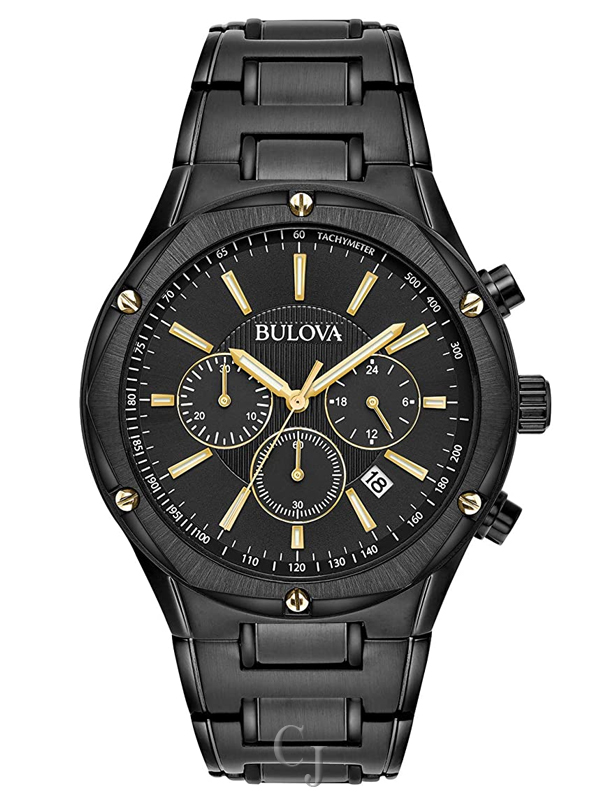 This men’s watch features a black dial with gold-toned luminous hands and markers, a date display between the four and five o’clock hour, three chronograph sub-dials and a tachymeter with a gold-toned screw accented bezel in a 43.0mm black ion-plated stainless steel case. The reliable Japanese quartz movement ensures accurate time keeping. The black ion-plated stainless steel link bracelet secures with a double-press fold-over clasp.