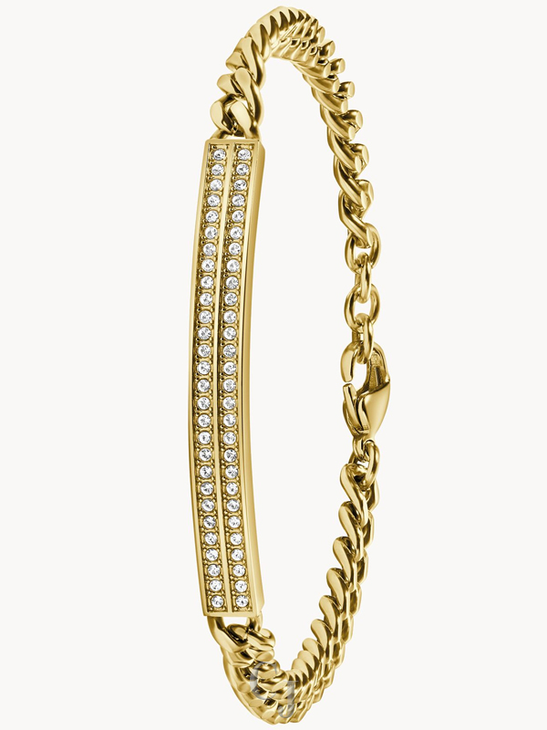 Add sparkle to your style with this Classic collection gift set. The timepiece includes a white sunray dial with a calendar window at 3 o’clock, a gold-tone stainless steel case with 60 crystals on the bezel, and a polished gold-tone stainless steel bracelet. A gold-tone stainless steel jewelry bracelet completes the gift set with 56 crystals set on the center plate and a lobster claw closure.
