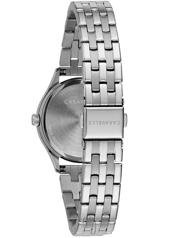 The Caravelle 43M115 is an elegant and stylish women’s wristwatch designed with precision and functionality in mind. Its round, 32-millimeter stainless steel case boasts a slender profile at 8.7 millimeters thickness, presenting a timeless and sophisticated appearance. The black analog dial is protected by a durable mineral window and features a date calendar for added practicality. The watch is powered by a reliable quartz movement, ensuring accurate timekeeping. Its stainless steel band with a 16-millimeter width and push-button foldover clasp offers both comfort and security on the wrist. With water resistance up to 100 feet, this watch is suitable for everyday wear, and the stationary stainless steel bezel adds a touch of refinement. The Caravelle 43M115 is not only a timekeeping instrument but also a fashion statement, with its sleek silver design and second hand feature.