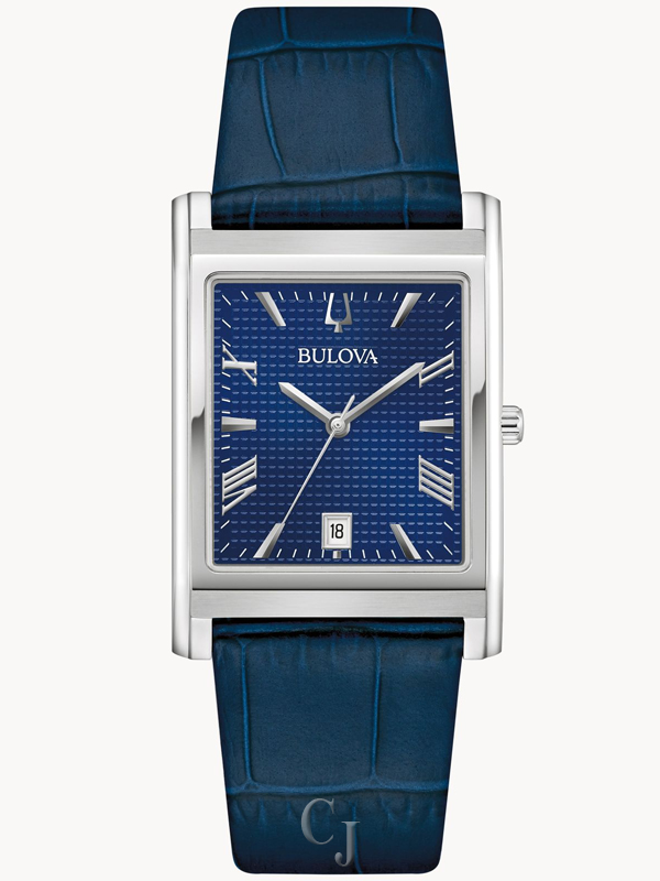 The rectangular men’s Sutton is the new paragon for classic elegance. Crafted with a sleek geometric design with brushed and polished finishing, the slim silver-tone stainless steel case is set with a sapphire crystal and features thoughtfully incorporated angles and lines for an impactful presence on the wrist. The textured blue dial’s hobnail pattern provides an iconic look, while the alternating silver-tone baton and Roman numeral markers convey a timeless quality. The dial is further appointed with a 6 o’clock date display and polished silver-tone hands. The watch is carefully paired with a blue embossed leather strap fitted with a pin buckle closure. Elevate your style with the slim and stylish rectangular Bulova Sutton.