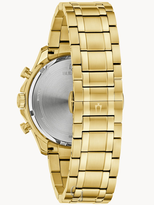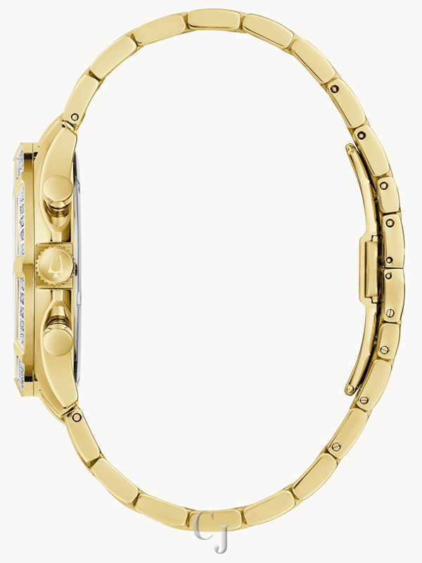 This men’s six-hand chronograph from the Bulova Classic collection balances sporty flair and timeless luxury. Encased in gold-tone stainless steel, its sleek silhouette exudes sophistication, further elevated by the presence of 24 dazzling diamonds meticulously set in the bezel. The tiered silver-white dial commands attention with 8 diamond markers, alongside a date and three sub-dials showcasing running seconds, chronograph minutes, and chronograph 1/20 seconds. The timepiece is paired with a gold-tone stainless steel bracelet with a double press deployant buckle closure providing a secure fit. Designed to accompany a luxurious lifestyle, this Bulova men’s timepiece is an indispensable part of any discerning collection.