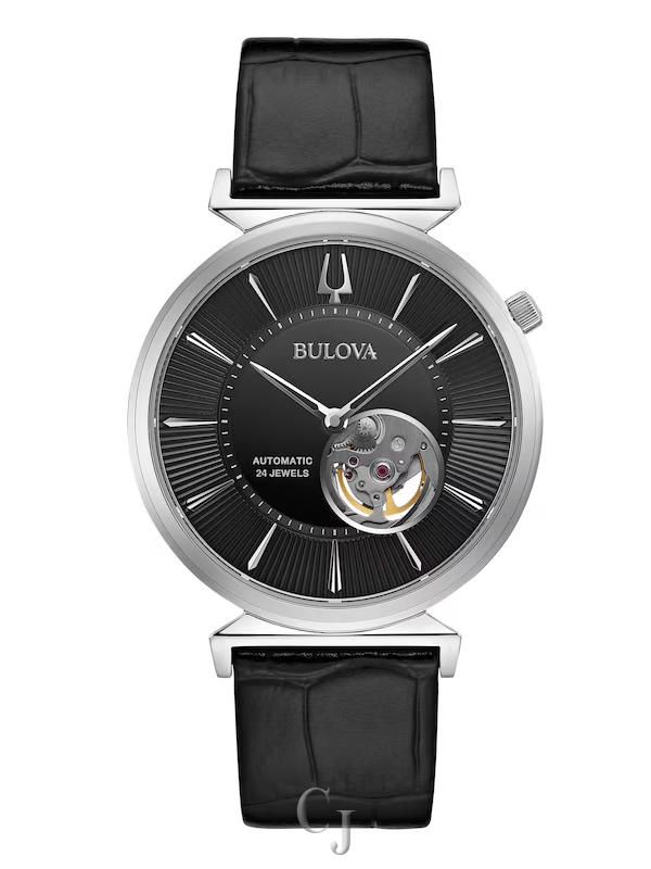 The Bulova Classic Regatta Automatic Men’s Watch (Model 96A234) blends timeless design with modern touches. Its 40mm stainless steel case features a black dial with silver-tone hands and stick indexes, protected by sapphire crystal. An open aperture and exhibition case back reveal the 24-jewel automatic movement with a 42-hour power reserve. With a crown at 2 o’clock, angled lugs, and a black leather strap, this water-resistant timepiece is both elegant and functional.