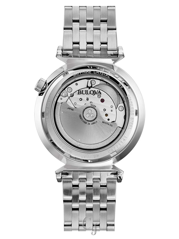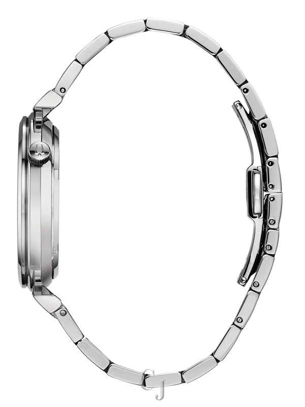 The Bulova Classic White Dial Men’s Watch (Model 96A235) features a 40mm stainless steel case, open aperture white dial, and exhibition case back showcasing a 24-jewel automatic movement with a 42-hour power reserve. Unique angled lugs, a 2 o’clock crown, and a stainless steel bracelet with alligator grain texture complete the design. Protected by a flat sapphire crystal, it is water-resistant up to 30 meters, offering timeless style and functionality.