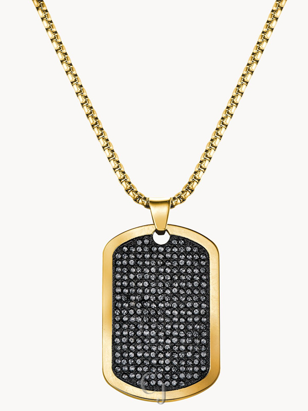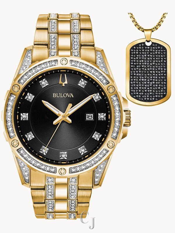Stand out in this watch and coordinating dog tag set. Watch features a gold-tone stainless steel case and bracelet set with 143 crystals along the case, bracelet and black dial. Watch features a flat mineral crystal, three-hand calendar quartz movement, and water resistance to 50 meters. Dog tag is set with 254 black crystals, on a 24 inch long round box link chain.