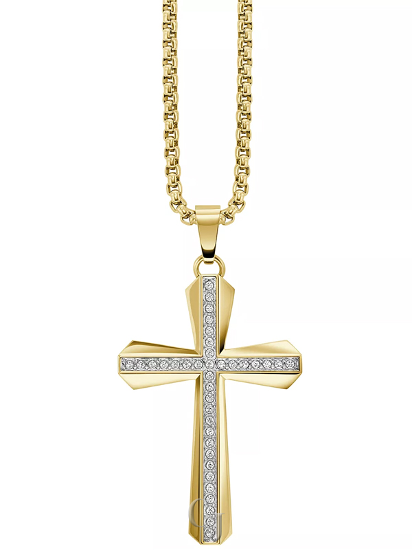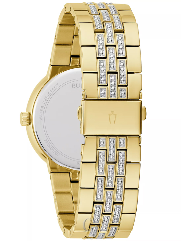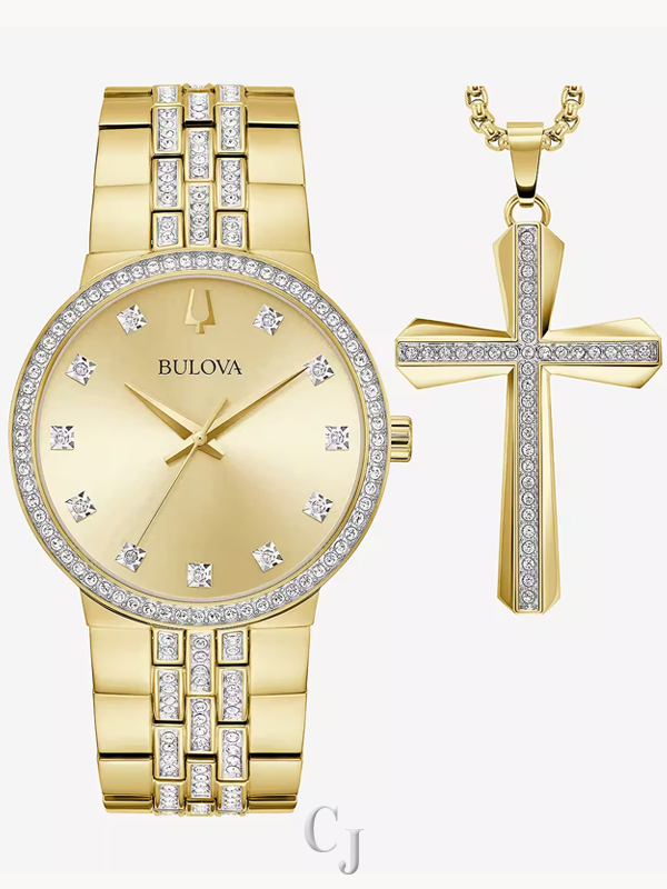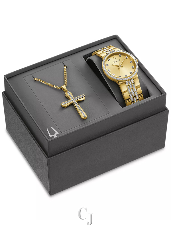 This men’s box set from the Bulova Crystal collection epitomizes smart, refined style. The gold-tone stainless steel case balances elegance and modern design with a sophisticated bezel set with crystals. The radiant champagne dial features striking gold-tone accents and is set with 11 crystal hour markers. Crystals on the gold-tone stainless steel bracelet complement the case and dial, while the bracelet’s fold-over buckle closure with a buckle closure with pushers ensures a perfect fit. Completing the sophisticated watch is a cross pendant in gold-tone stainless steel, set with crystals from end-to-end. With its brilliant gold-tone finish and 220 crystals, this Bulova men’s timepiece and its necklace are perfect for every occasion.