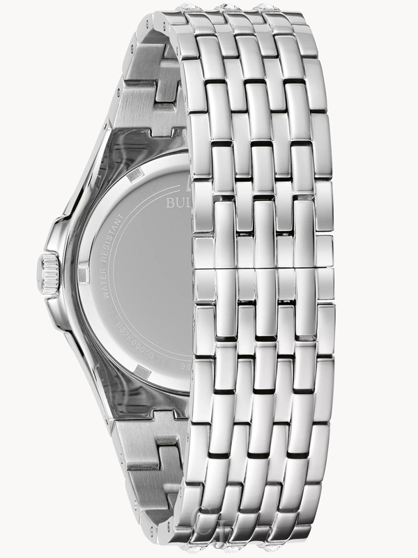 The crystal Phantom from Bulova is a statement timepiece designed to stand out. It features a stainless steel silver-tone case, and 89 authentic baguette shaped crystals. The rich emerald color dial makes a bold statement, finished off with a silver-tone stainless steel bracelet. It features a three-hand quartz movement, and it is designed for those who are looking to make a bold fashion statement style, evoking a luxurious look.