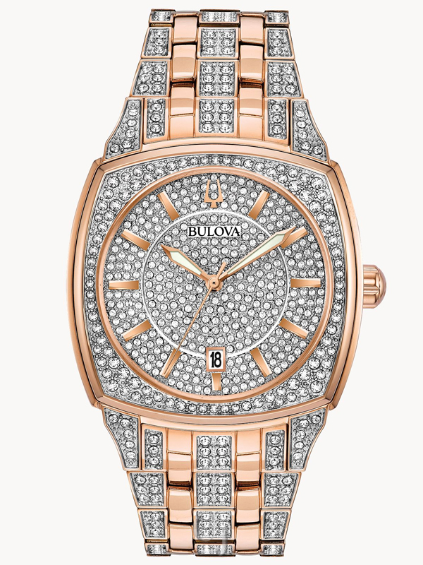 Dress watch opulently embellished with 582 crystals on the cushion-shaped stainless steel and rose gold-tone case and bracelet, and round pave set three-hand silver white dial with date feature. Curved mineral crystal, deployant closure, quartz movement, and water resistance to 30 meters.