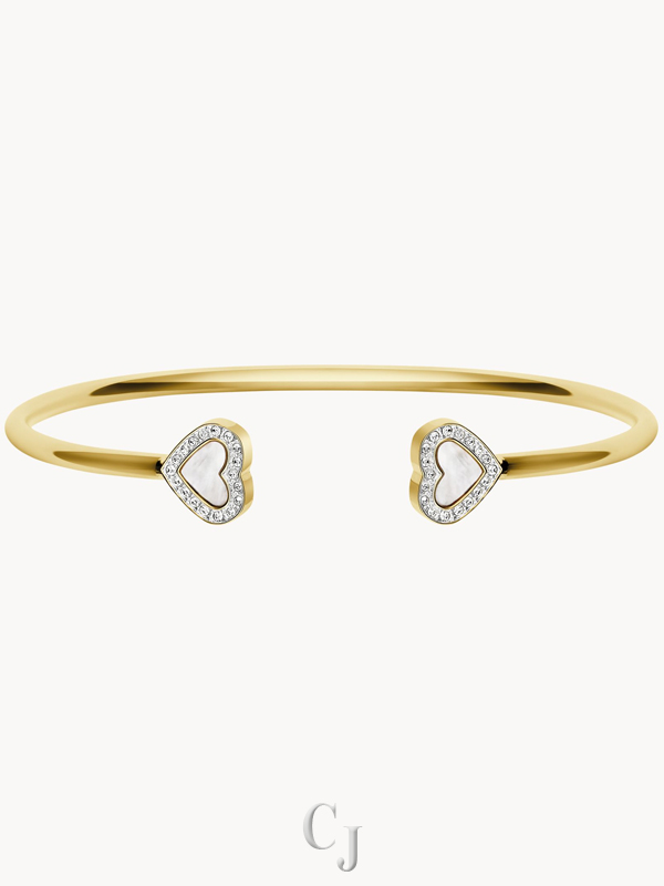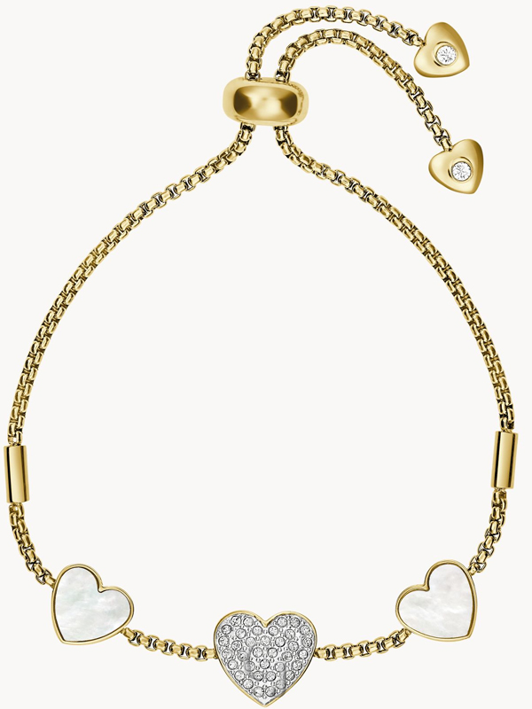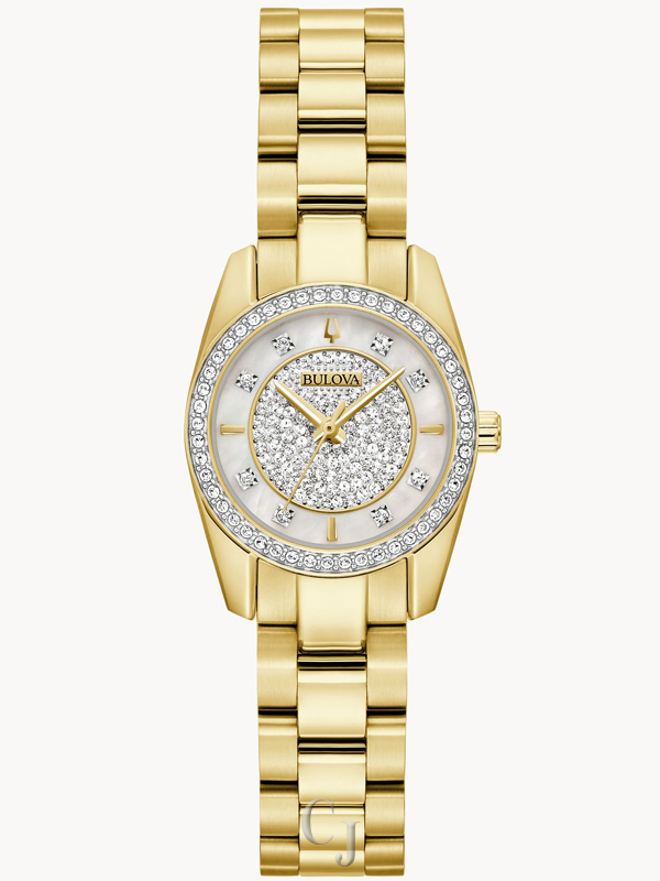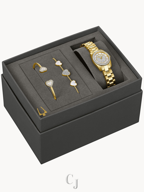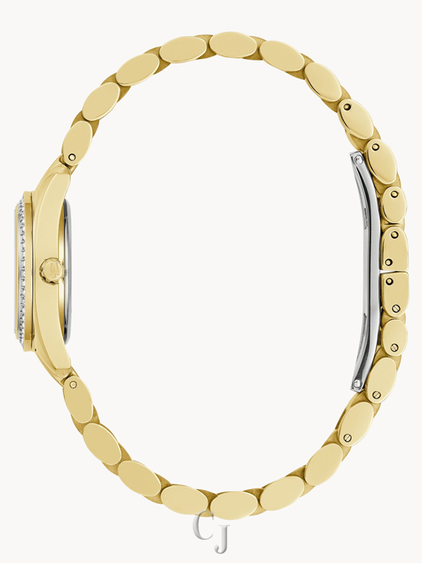 A dazzling display of luxurious design, this Bulova ladies’ box set includes a Crystal collection timepiece and two bracelets. The gold-tone stainless steel case of the timepiece features a tapering design the curves effortlessly around the wrist, with brushed finishing and polished accents and embellished with 48 crystals. The mother-of-pearl dial features gold accents, 8 sparkling crystal hour markers, and a pave center formed by 102 meticulously set crystals. The timepiece is completed with a matching gold-tone stainless steel bracelet with a deployant buckle. Complementing the timepiece are two bracelets: a refined gold-tone memory bangle with mother-of-pearl hearts bordered with 36 crystals and a contemporary gold-tone bolo chain bracelet, alternating with small mother-of-pearl hearts and larger pave crystal hearts with a total of 38 crystals. As versatile as it is stylish, this Bulova ladies’ box set can be worn all at once or separately, perfect for accompanying you day to day.