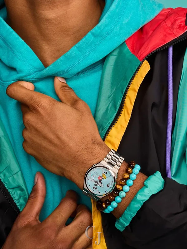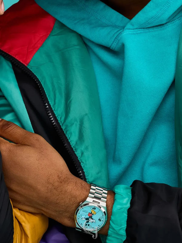 Spring into action with the new TSUYOSA Mickey Mouse, an automatic sports watch. Our TSUYOSA collection is characterized by colorful dials, and in this new style we see jumping-for-joy Mickey Mouse in the center of a sky blue sunray dial with tooled hands while three tilted numeric markers suggest his energy and bouncy motion. The substantial faceted silver-tone stainless steel 40mm case and brushed and polished integrated bracelet make an elegant statement, and the open case back reveals the 21-jewel movement. Designed for both Disney devotees and fans of fine craftsmanship, this fan-favorite timepiece is built to last.