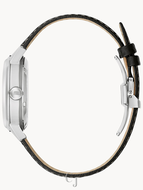 Be impeccably dressed with a Frank Sinatra timepiece on your wrist. Incorporating vintage Bulova designs with the iconic elements of the legendary performer, ‘Summer Wind’ is the newest addition to our collection of timepieces that pay tribute to Frank Sinatra’s most famous songs. This collector’s watch has a cool elegance like Sinatra himself and features a silver-tone stainless steel case, silver-tone hands and markers, and a black dial with orange accents – “Orange is the happiest color,” Sinatra once said. It also features a self-winding 21-jewel automatic movement with a 42-hour power reserve and calendar. Sinatra’s classic fedora is displayed on the dial, finished with a domed sapphire crystal with AR coating. The exhibition case back showcases the fine movement, as well as the song title and fedora hat. The black textured leather strap with stitching detail is stamped with the song title along the inside and features a double-press deployant buckle closure. Water resistant to 30 meters.