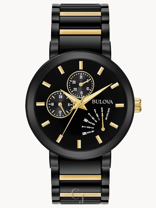 Black IP stainless steel case and black dial with day/date/24-hour feature, domed mineral glass, metalized edge-to-edge crystal, screw-back case, black and gold-tone bracelet with deployment closure.