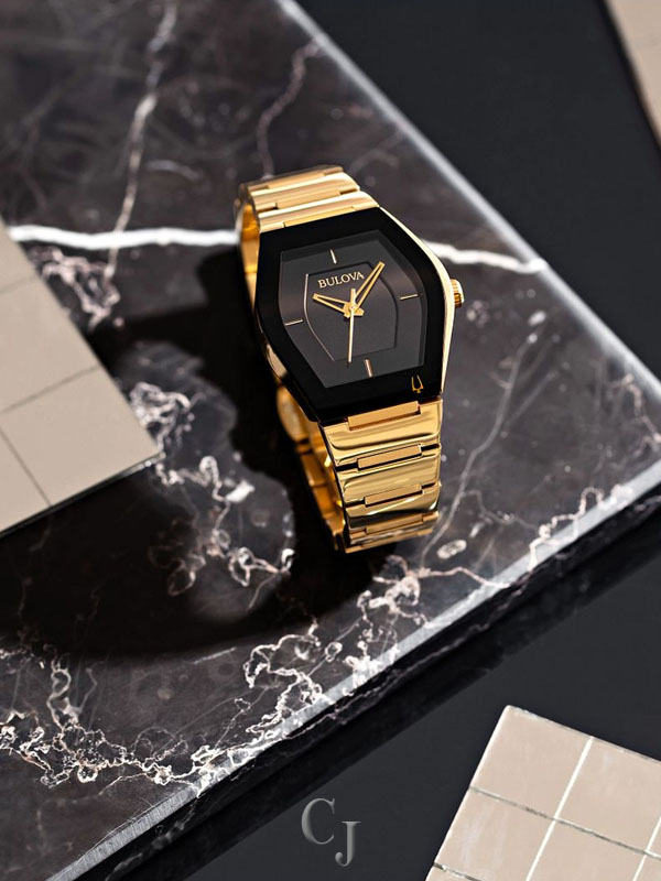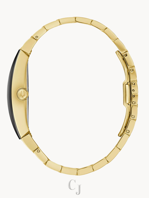 Distinctive asymmetrical tonneau shaped gold-tone stainless steel case with a black signature Futuro edge to edge curved metalized crystal features a black dial with gold-tone accents, and a gold-tone stainless steel bracelet. The watch features a three-hand quartz movement, deployant buckle with pushers, and water resistance to 30 meters.