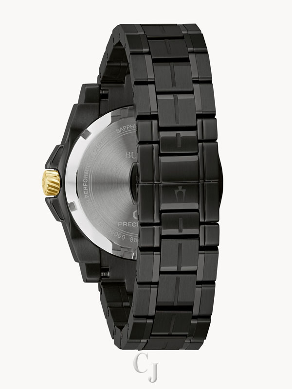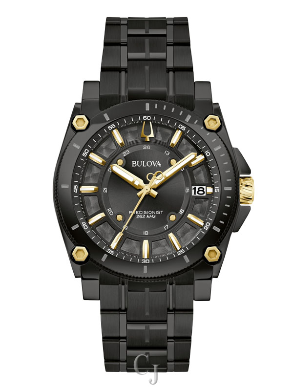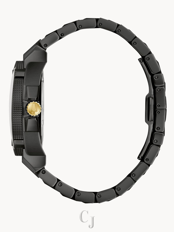 Bulova introduces a new addition to its stylishly adventurous men’s Icon Collection, continuing the line’s commitment to exceptional precision remarkable design. The 40mm black ion-plated case is crafted from 316L stainless steel for exceptional durability and features modern styling, with gold-tone accents, and a curved sapphire crystal. The black multi-level dial features luminescent gold-tone hands and markers and a date display. The watches of the Icon Collection are powered by Bulova’s Precisionist movement, a revolutionary 8-jewel quartz mechanism vibrating at a remarkable 262kHz, accurate to 5 seconds per month with increased resistance to temperature changes, and with a sweeping seconds hand. The watch features 100m water resistance and is complemented by a matching bracelet with a deployant closure. Make a statement and show your style with this bold new men’s timepiece from the Bulova Icon Collection.