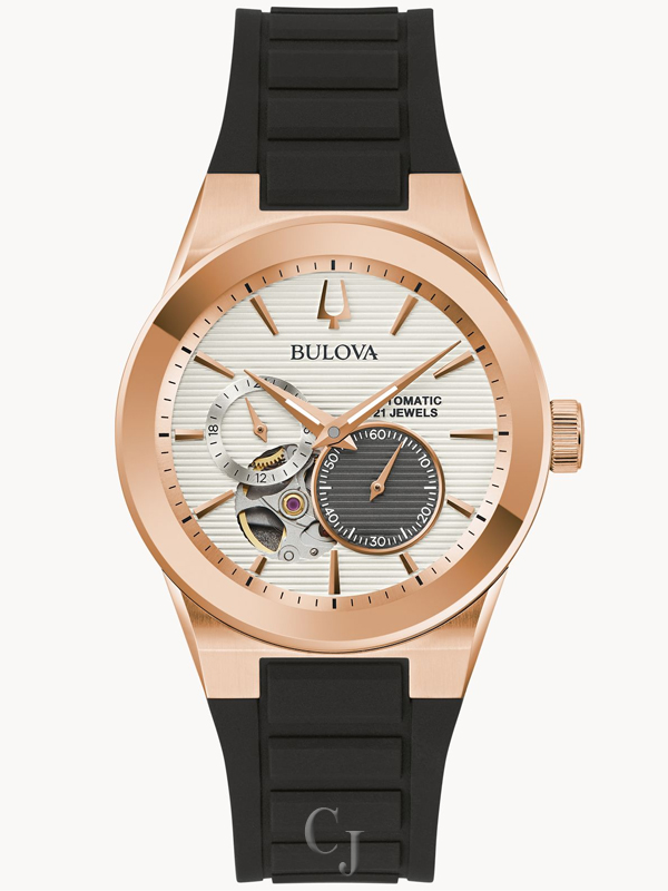 As the official Timepiece partner of The Latin GRAMMY®, Bulova has built upon the Latin GRAMMY® Automatic watch, incorporating musical cues in its design in a slimmed down 38mm case. The distinct timepiece features an open heartbeat aperture and an exhibition case back, showcasing the fine 21-jewel automatic movement with a 42-hour power reserve. The rose gold-tone stainless steel case features a silver-white dial with a black-gray subdial, both of which are textured to resemble the guiro instrument, with guiro scraper-shaped markers designating the hours. The case back is further enhanced with a glass insert customized with the Latin GRAMMY® 25th Anniversary logo. The watch is paired with a fitted black silicone strap that meets the case to create a seamless silhouette on the wrist. Together with the Latin Recording Academy, Bulova once again celebrates the diverse beauty of Latin music with the Latin Automatic watch.
